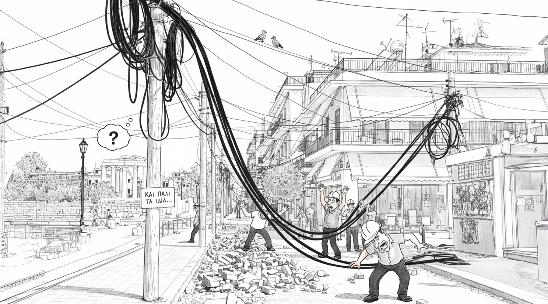 Αν η επιλογή είναι όντως τα εναέρια δίκτυα, τότε προκύπτει το κρίσιμο ερώτημα: ποιος ο λόγος της εκτεταμένης χρήσης κυβόλιθων στους νέους πεζοδρόμους; Οι κυβόλιθοι, εξ ορισμού, επιλέγονται ακριβώς επειδή επιτρέπουν την εύκολη πρόσβαση στο υπέδαφος για την εγκατάσταση ή επισκευή δικτύων, χωρίς την καταστροφή του οδοστρώματος. Η απόφαση για εναέριες ίνες, ενώ ταυτόχρονα τοποθετούνται παντού κυβόλιθοι, συνιστά ένα μνημείο παράλογου σχεδιασμού και σπατάλης δημόσιου χρήματος.